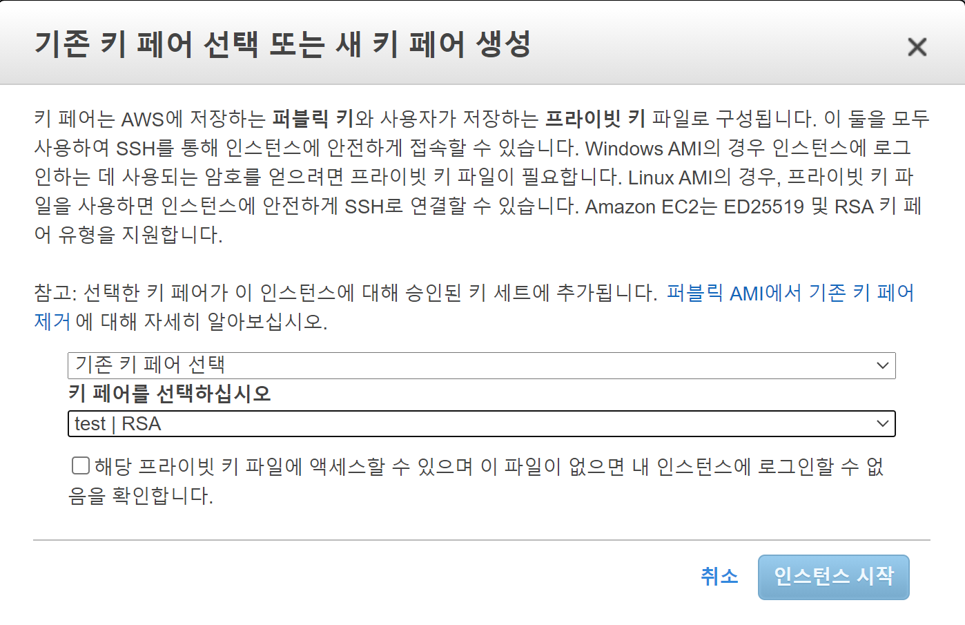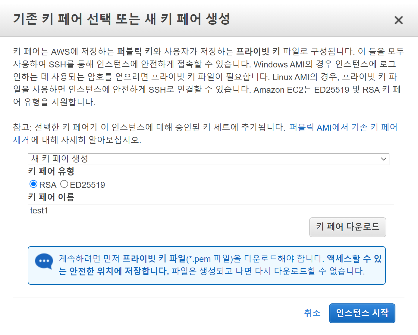 키 페어가 있는 경우는 기존 키 페어를 선택해주고 기존 키 페어가 없는 경우 새 키 페어를 생성해 줍니다.