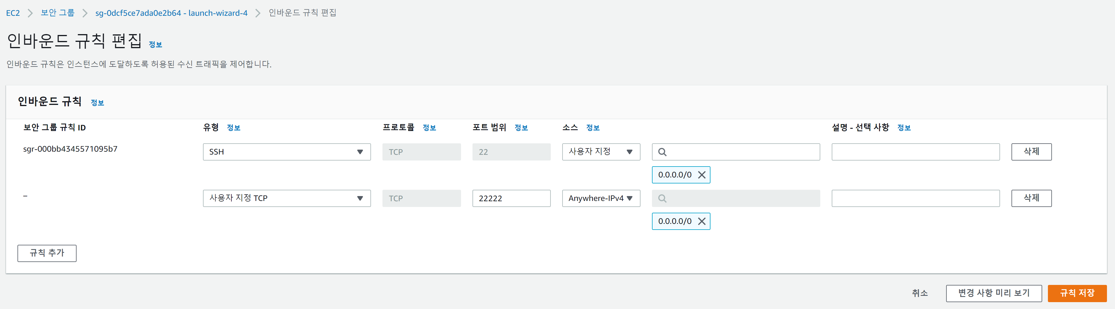 위의 명령어를 입력하면, 접속이 될 수도 있고 안될 수도 있습니다. 될 수도 있고 안될수도 있다니?? 그 이유는 바로 보안그룹 때문입니다. 처음에 기본으로 EC2를 만들면 서버의 접속을 위해 ssh 22번이 기본으로 생성이 됩니다. 위에서 ssh 접속을 할 때 22222번 포트를 사용하기에 보안그룹에 22222번 포트를 추가해줘야 합니다.