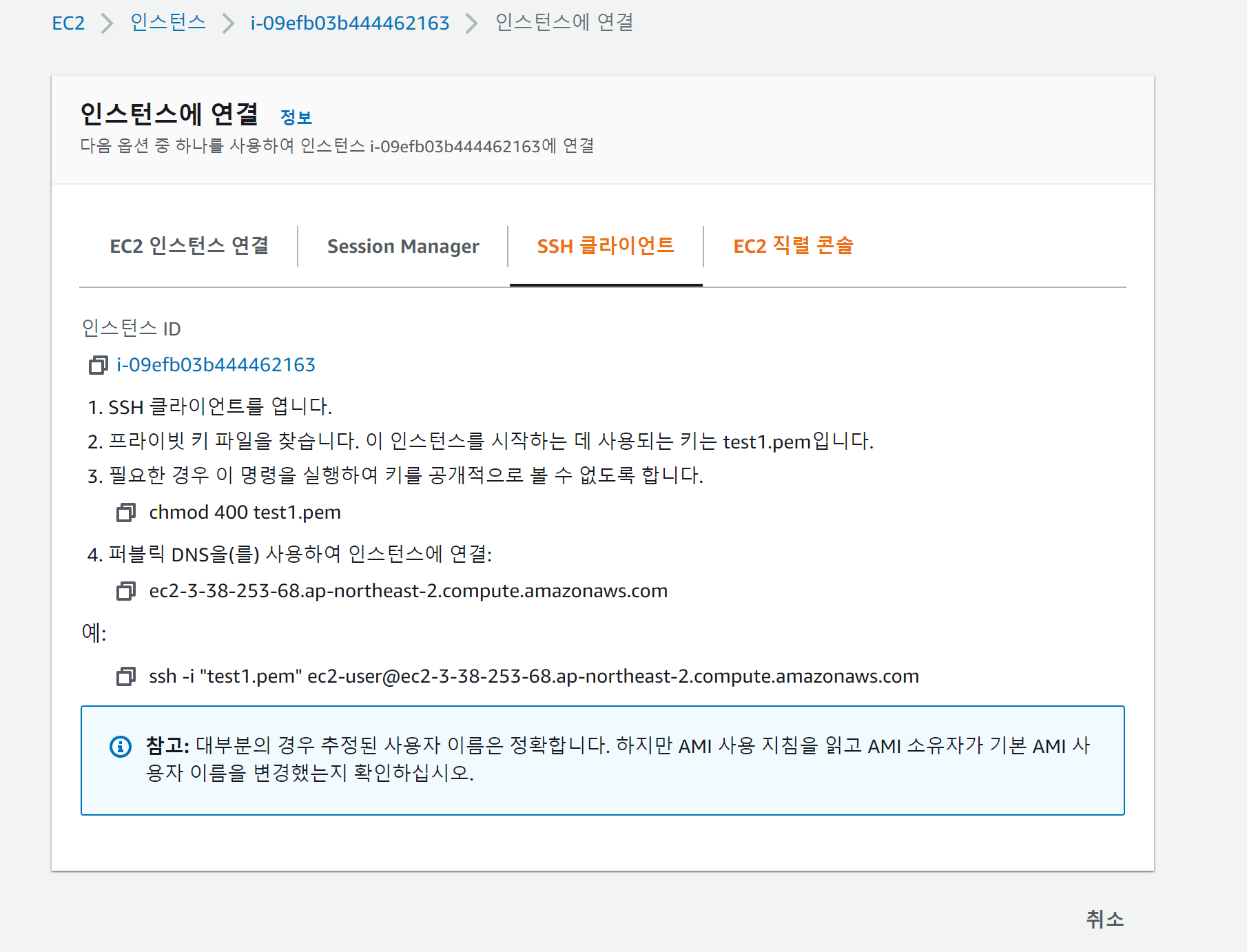 ssh -i test1.pem ec2-user@3.38.253.68 -p 22222