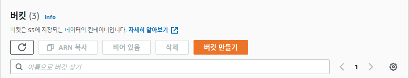 S3 서비스에 들어가서 버킷 만들기를 클릭합니다. 버킷은 S3에 저장되는 데이터의 컨테이너입니다. 쉽게 생각하면 하나의 데이터 저장소라고 생각하면 됩니다.