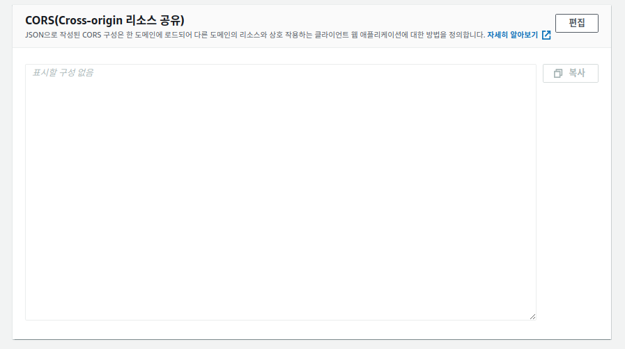 다음은 CORS에 대한 정책을 생성하는 부분입니다. 이 부분은 S3를 이용하여 웹 호스팅을 보여줄 때 자세하게 설명하겠습니다.