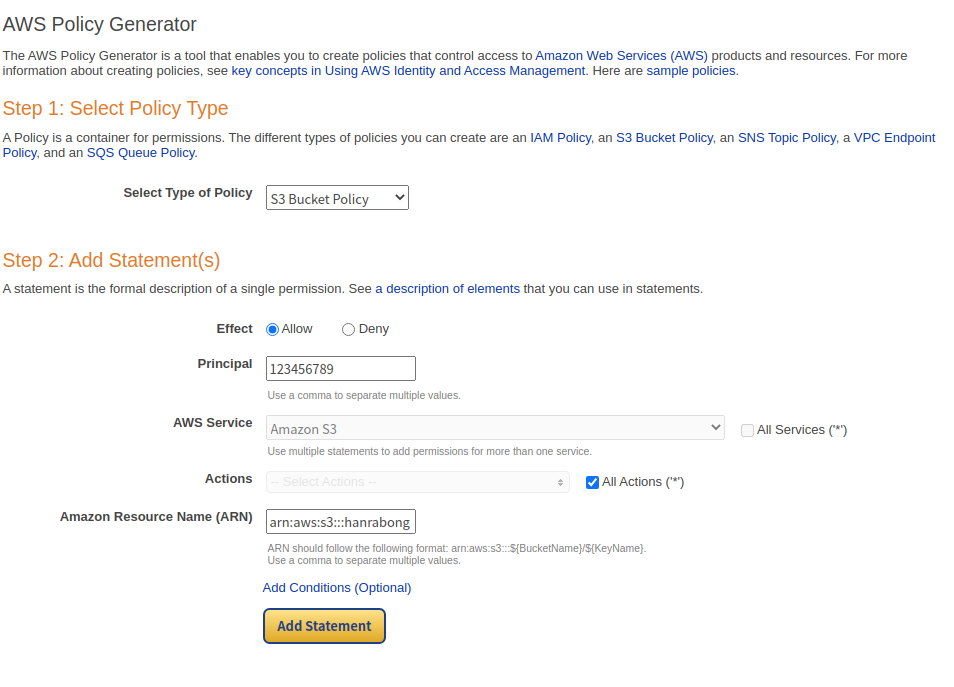 버킷 정책을 생성하는 페이지를 누르면 AWS 정책 생성기 페이지가 보입니다. S3 bucket 정책뿐만 아니라 IAM 정책, SQS, SNS 정책 등 여러 정책을 생성 할 수 있습니다. 저희는 S3 정책을 만들것이기에 S3 bucket policy를 선택합니다. 두 번째 Step을 보면 Effect라고 보이는데 이 설정은 등록할 action을 금지 시키는 것인지 하게 하는것인지를 선택하는 것입니다. 다음으로는 Principal이라고 보이는데 여기에는 자신의 계정을 입력하면 됩니다. 계정이라 하면 아이디인지 닉네임인지 헷갈릴 수 있습니다. aws 오른쪽 위를 보면 종 모양 옆에 자신의 닉네임이 있는데 이 닉네임을 클릭하면 내 계정이라고 나오고 옆에 숫자가 있습니다. 이 숫자를 기입하면 됩니다. action 설정은 자신이 원하는 action을 선택하면 됩니다. ARN 부분에는 이 사진 바로 위 사진을 보면 버컷 ARN을 볼 수 있습니다. 이 내용을 가져다가 기입하면 됩니다. 다 기입을 했으면 Add Statement 버튼을 클릭해 줍니다.