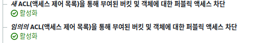 - 새 ACL(액세스 제어 목록)을 통해 부여된 버킷 및 객체에 대한 퍼블릭 액세스 차단