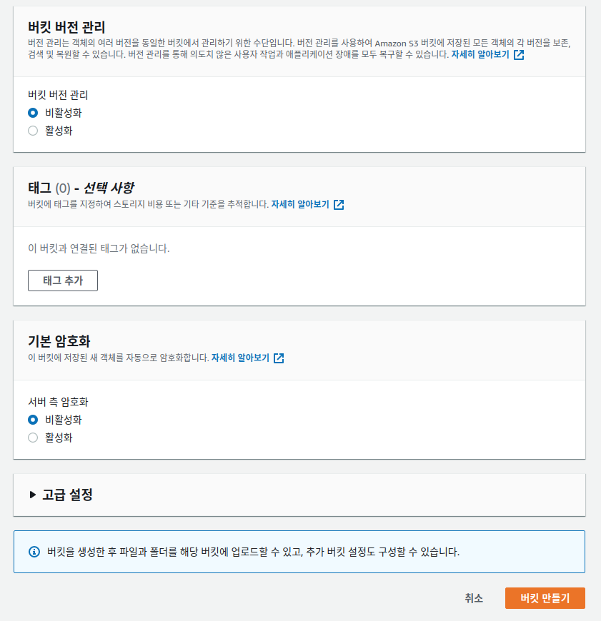 버킷 버전 관리를 할 것인지 안할 것인지 선택하고 태그와 객체에 암호화를 할 것인지 선택합니다. 고급 설정에는 객체 잠금을 활성화할 것인지 비활성화 할것인지에 대한 선택이 있습니다. 지금 실습에서는 간단하게 S3 버킷을 생성할 것이기에 기본 세팅 그대로 바꾸지 않고 버킷을 만들어 줍니다.
