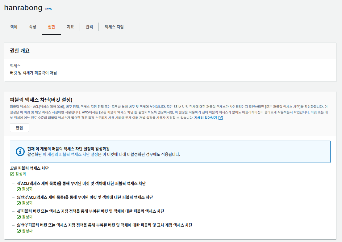 - 임의의 ACL(액세스 제어 목록)을 통해 부여된 버킷 및 객체에 대한 퍼블릭 액세스 차단