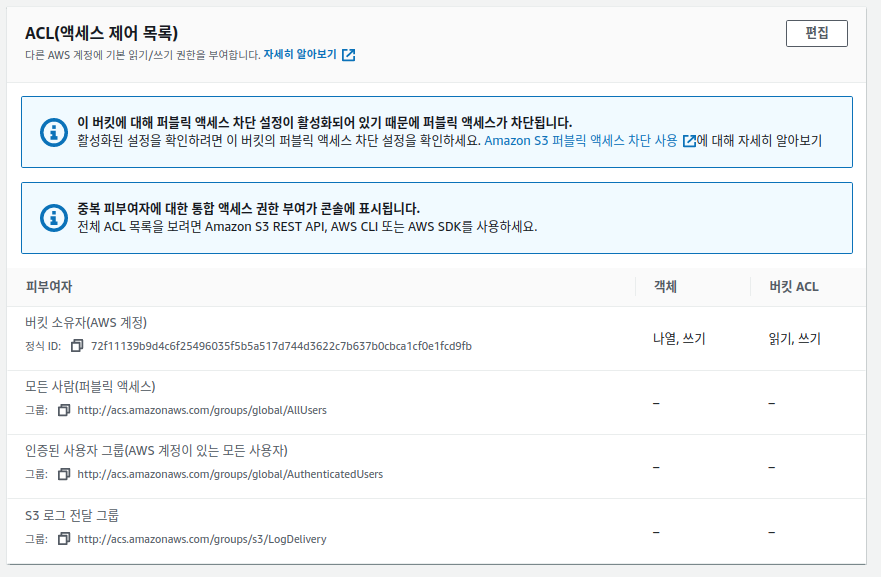 다음은 ACL 편집하는 기능입니다. 기본적으로 버킷 소유자 많이 객체에 나열하고 쓸 수 있고 버킷 ACL을 읽고 쓸 수 있습니다. ACL을 편집하기 위해서는 퍼블릭 액세스 차단 설정의 첫번 째 옵션인 <새 ACL(액세스 제어 목록)을 통해 부여된 버킷 및 객체에 대한 퍼블릭 액세스 차단>을 비활성화 해줘야 합니다. 첫 번째 옵셥을 비활성화해야 새롭게 권한을 부여해줄 수 있습니다. 비활성화 하지 않으면 Access Denied라는 오류가 나옵니다. 또한 권한을 부여하고 이 권한을 유지하기 위해서는 2번 째 옵션을 비활성화해야 합니다. 조금 복잡할 수도 있지만 간단하게 말하자면 첫 번째 권한은 새로운 ACL을 생성해준다고 생각을 하면 되고 두 번째 권한은 만든 ACL을 사용하기 위해 필요하다고 생각을 하면 됩니다.