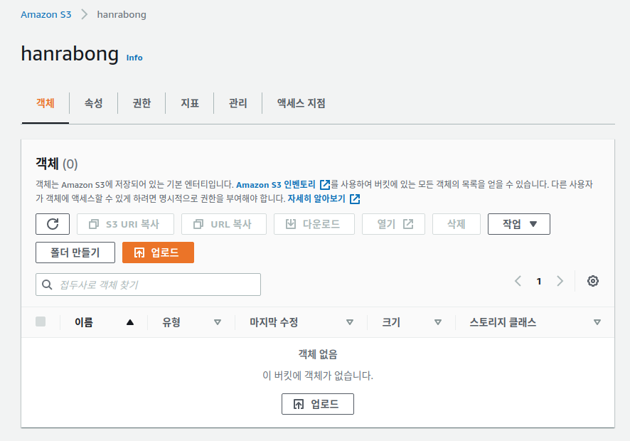 버킷이 생성이 되었으면 해당 버킷을 클릭하여 안으로 들어가봅니다. 다음과 같은 구조를 볼 수 있습니다. 객체 부분에서는 파일을 업로드 하거나 폴더를 업로드 할 수 있고 폴더를 만들어서 해당 폴더 안에 파일을 업로드 할 수 있습니다.