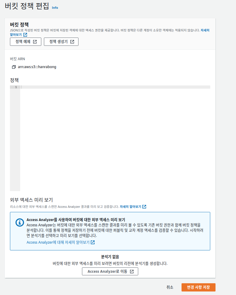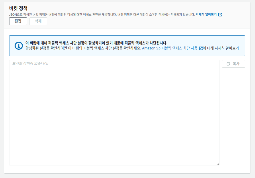 다음은 버킷 정책입니다. 버킷 정책 부분에서는 버킷 정책을 작성하여 버킷에 저장된 객체에 대한 액세스 권한을 제공합니다. 편집을 눌러서 버킷 정책을 작성하는 법을 알아보겠습니다.