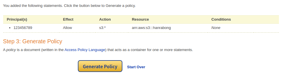 Add Statement 버튼을 누르면 다음과 같이 statement가 생성이 된것을 볼 수 있습니다. 다른 action도 생성을 하고 싶으면 필요한 만큼 계속 추가를 해줍니다. 원하는 statement를 다 만들었으면 Generate Policy 버튼을 클릭하여 정책을 생성해 줍니다.
