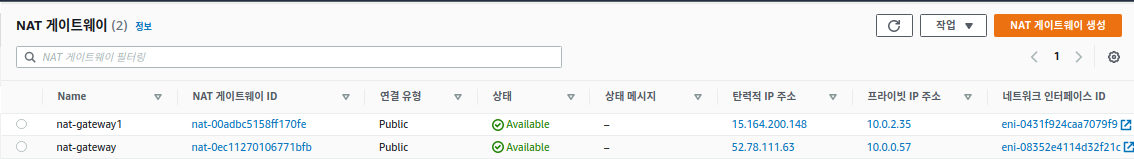 서브넷을 생성할 때 고가용성을 위해서 2a와 2c 리전에 서브넷을 만들었기에 각각 nat gateway를 생성해주면 됩니다.