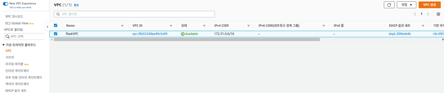 VPC를 선택하면 다음과 같은 화면이 보입니다. EC2를 만든 적이 있다면 기본 VPC가 이미 존재합니다. 오른쪽 위에 있는 VPC 생성 버튼을 클릭해줍니다.