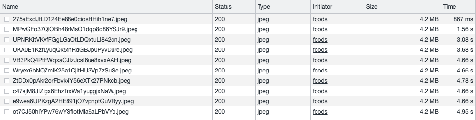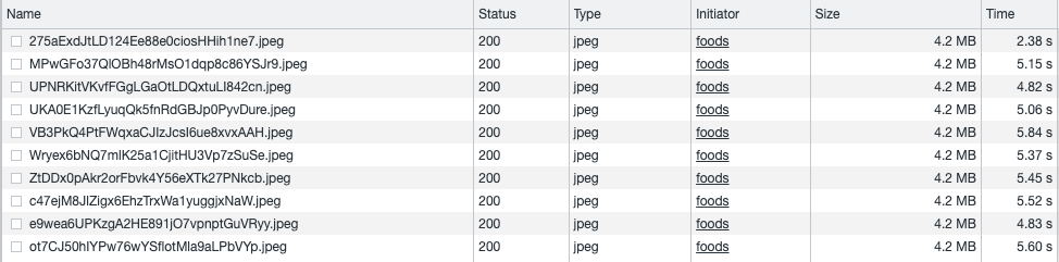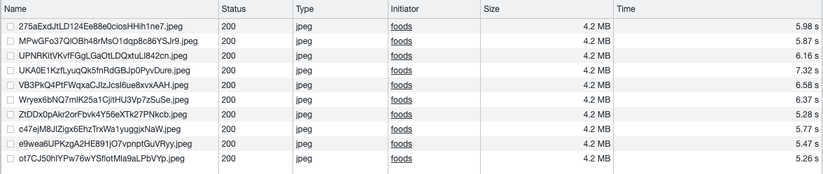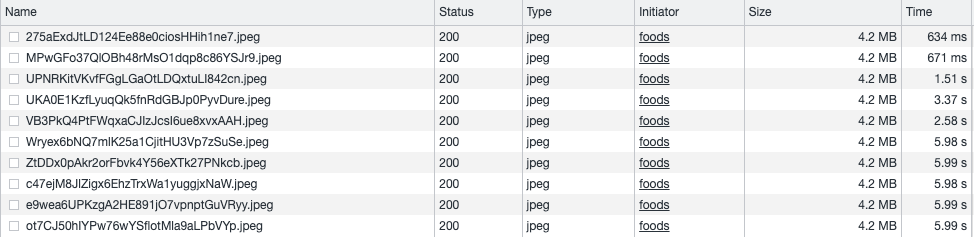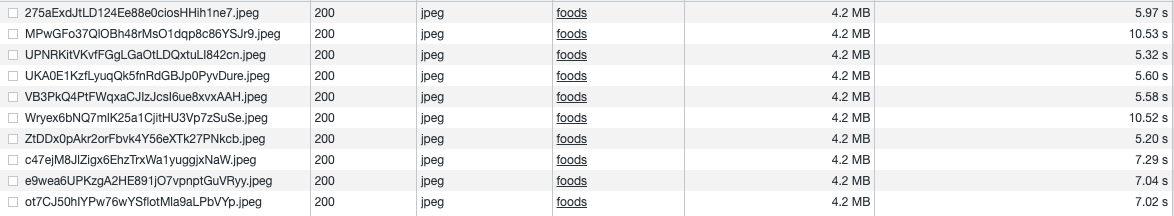 CloudFront를 이용했을 때 걸린 네트워크 시간은 다음과 같습니다. 첫 번째 사진의 경우는 CloudFront에 사진이 없어 CloudFront가 S3에 요청을 해서 사진을 갖고 올 때 걸리는 시간 입니다. 나머지 3장의 경우는 CloudFront에 사진이 존재하여 cache hit되어서 사진을 받아오는 경우입니다. 사진 10장이 전부 도착했을 때 걸리는 평균시간은 5.19s 이었습니다.