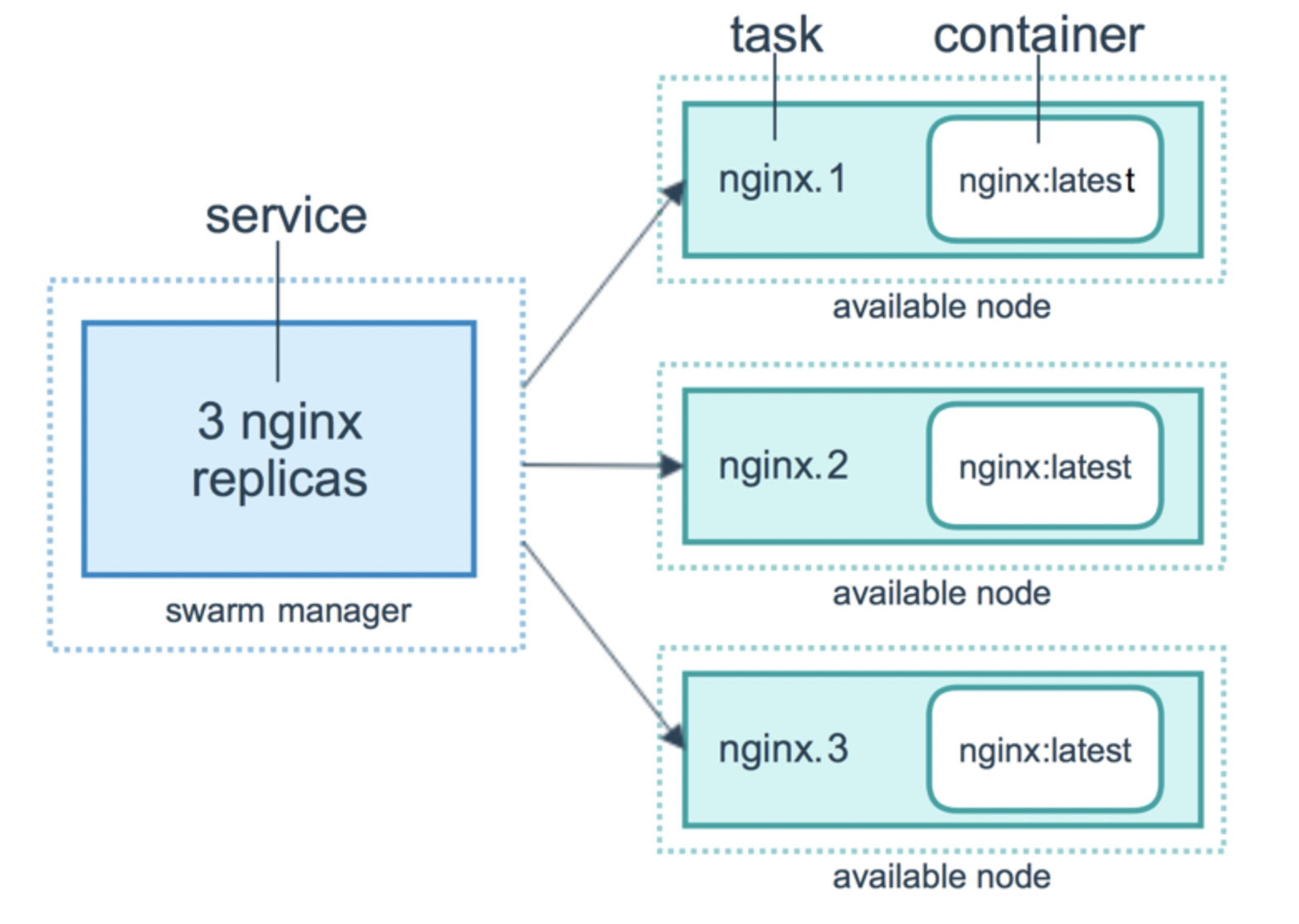 Task는 swarm의 atomic scheduling unit입니다. Task를 통해 Docker container와 container안에서 실행할 명령어를 전달합니다. Manager node는 서비스 규모에 설정된 복제본 수에 따라 worker node에 task를 할당합니다. task가 node에 할당되면 다른 node로 이동할 수 없습니다. 할당된 node에서만 실행되거나 실패할 수 있습니다.