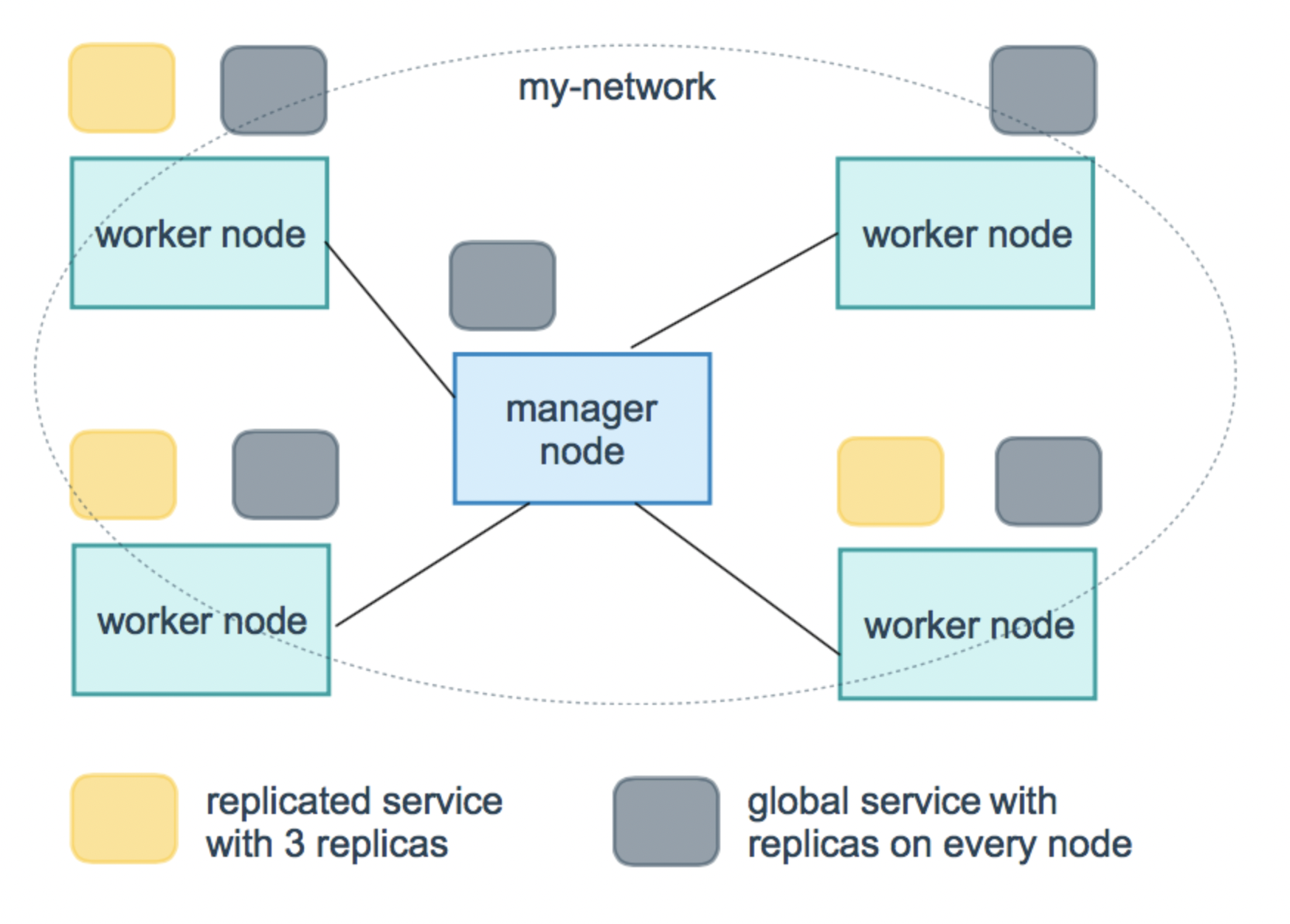 replicated service의 경우 사용자가 직접 얼마나 복제할지 명시를 해줘야 합니다. 그럼 manager node가 해당 숫자 만큼 task를 만들어서 worker node에 배포를 합니다.