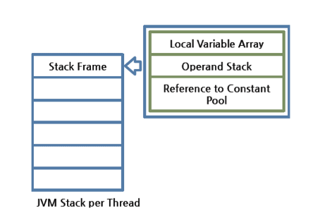 각 stack frame에는 지역 변수 array, Operand stack, 실행 중인 method가 속한 class의 runtime constant pool에 대한 참조가 있습니다. 지역 변수 array와 Operand stack의 크기는 컴파일하는 동안에 결정됩니다. 따라서 stack frame의 크기는 method에 따라 고정되어 있습니다.