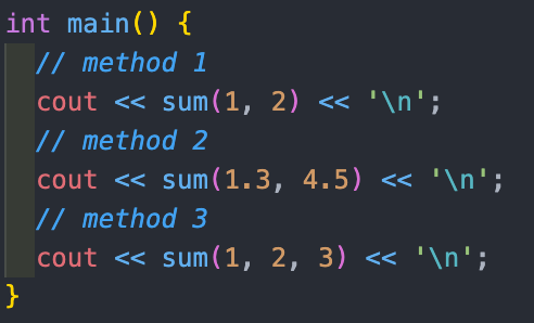 위에서 보면 sum으로 함수 이름이 전부 동일한테 어떻게 자신한테 정확히 맞는 함수를 찾아서 동작을 하는 것일까요? 컴파일러가 정확한 함수를 찾게 도와줍니다. 컴파일러가 코드를 컴파일할 때 오버로딩 되어 있는 함수를 전부 다른 이름의 함수명으로 변환해줍니다. 이런 개념을 name mangling이라고 합니다. 그러하여 Overloading이 compile time에 resolve 되었다고 표현을 합니다.