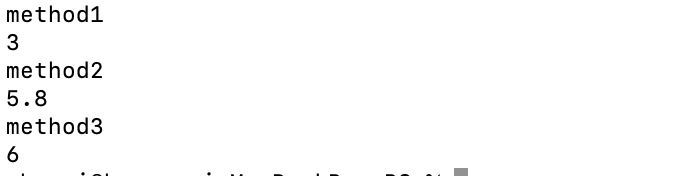 위의 사진에서 오른쪽 사진을 보면 함수가 3개 있습니다. int type argument 2개를 받아서 int type을 return 하는 return 하는 함수와 double type argument 2개를 받아서 double type을 return 하는 함수와 int type argument 3개를 받아서 int type을 return 하는 함수가 있습니다. 3개의 함수를 보면 이름이 모두 똑같습니다. 위의 프로그램을 실행시키면 다음과 같은 결과가 나옵니다.