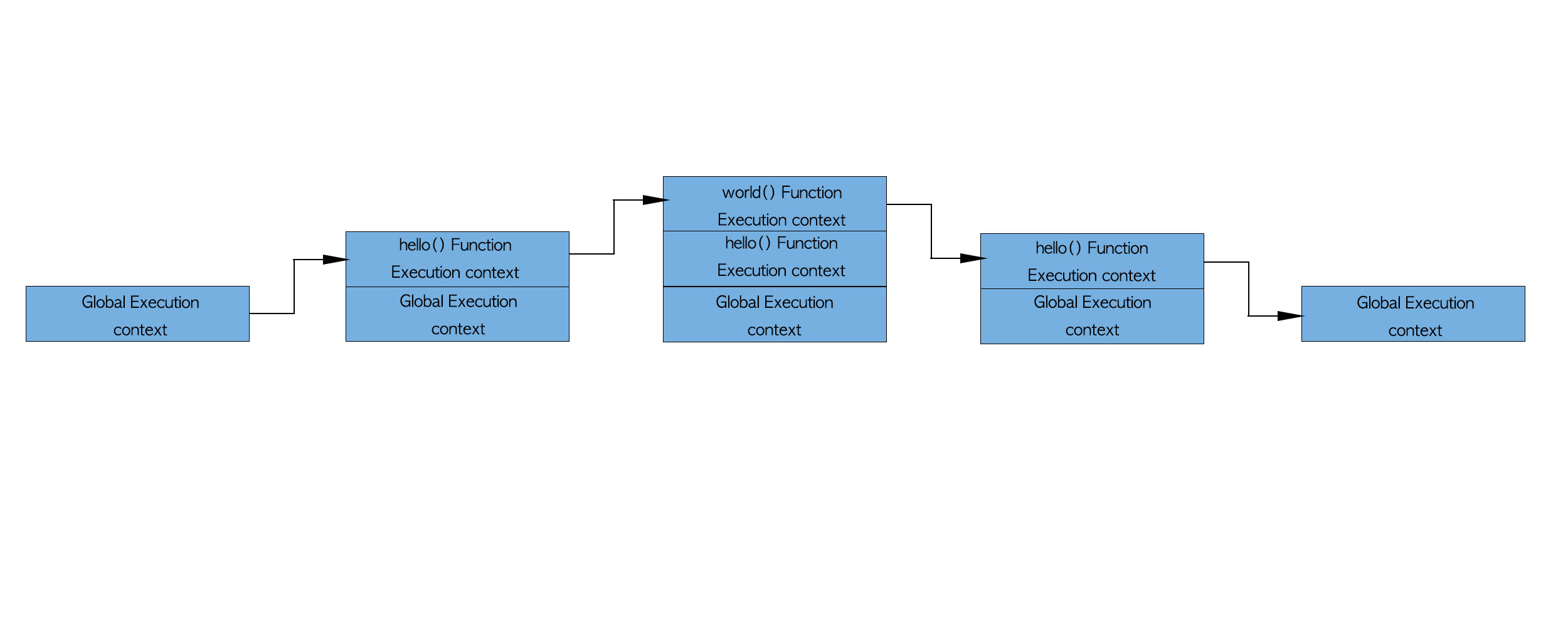 위와 같은 code가 실행이 되면 javascript engine은 global execution context을 만들어서 execution stack에 push합니다. 그 후에 hello() 함수를 마주치면 해당 함수에 대한 execution context를 만들어서 stack에 push합니다. hello 함수 내부에서 world()를 마주치면 world 함수에 대한 execution context를 만들어서 stack에 push합니다. world()함수 실행이 끝나면 stack에서 pop되고 hello()도 실행이 끝나면 pop() 됩니다. 그 후에 모든 코드가 실행이 끝나면 global execution context도 stack에서 제거됩니다.