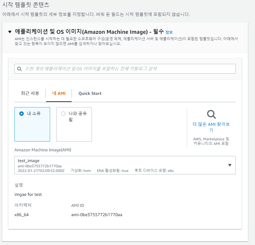다음은 시작템플릿 콘텐츠 입니다. 애플리케이션 및 OS이미지를 선택을 해줘야 하는데 옆에 필수라고 적혀 있습니다. 위에서 Auto Scaling 지침제공을 선택하면 생기는 옵션입니다. 위에서 만든 이미지를 선택하기 위해서 내 AMI를 선택하고 아까 위에서 만들어준 AMI를 선택해줍니다.