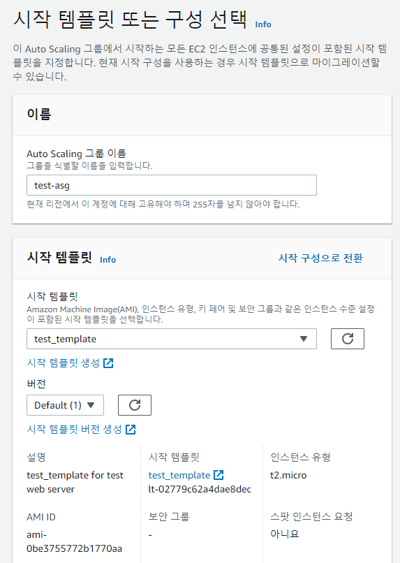 ASG이름을 입력하고 이전에 생성한 시작 템플릿을 선택해 줍니다.