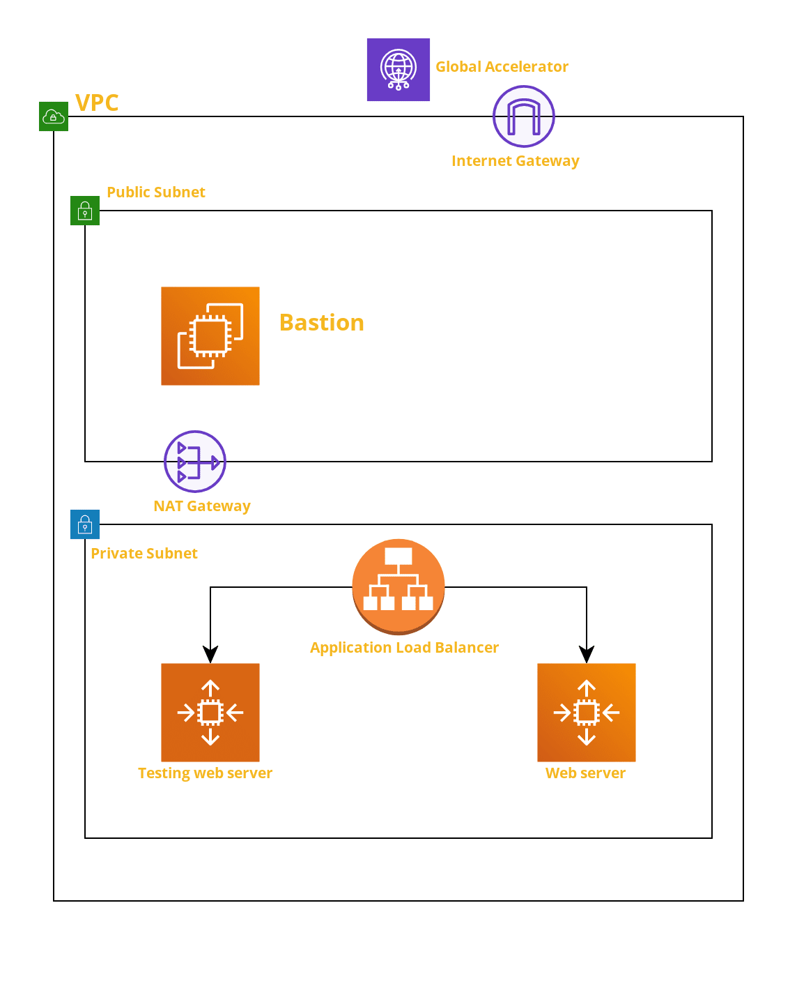 위의 사진을 보면 VPC, Subnet, Nat gateway, ALB, ASG 등등 여러 서비스들을 볼 수 있습니다. 그림만 봐서는 이해가 잘 되지 않습니다. 대략적으로 구조를 설명해 보겠습니다. VPC안의 private subnet 안에 ASG가 test용 실제 서버 용으로 각각 존재합니다. ASG 앞 단에는 Application load balancer가 존재하여 요청의 규칙에 따라 해당 asg로 보내줍니다. 또한 global accelerator를 이용하여 private subnet에 있는 alb에 접근 할 수 있게 해줍니다. 지금 당장 구조가 정확하게 이해가 안가더라도 실습을 해보면 조금 더 잘 이해가 될 것입니다.