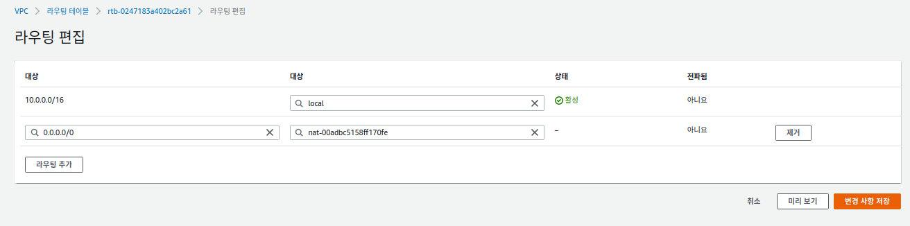 라우팅 편집에서 public subnet의 라우팅 테이블에 대한 편집이므로 10.0.0./16에서는 local에서 찾고 그 ip대역을 제외한 나머지 대역에서는 인터넷 게이트웨이로 향하게 해줍니다. 그렇게 라우팅 추가한 후 변경 사항 저장을 해줍니다.
