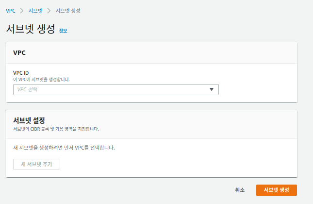 VPC를 선택하였으면 서브넷 설정을 할 수 있게 입력 창들이 나옵니다. 서브넷 이름을 입력을 하고 가용영역을 설정해줍니다. 그 후 서브넷의 IPv4 CIDR블록을 생성해줍니다. 여기서 주의할 점은 IPv4 설정의 경우, 서브넷이 VPC 안에서 생성이 되기에 VPC CIDR 범위에서 설정을 해줘야 합니다. 또한 Subnet끼리 CIDR 주소가 겹치면 안됩니다.