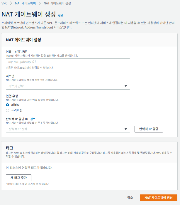 인터넷 게이트웨이는 말그대로 인터넷을 연결하는것이기에 보통 public subnet에서 라우팅 테이블을 연결하여 사용하게 됩니다. private subnet의 경우에 인터넷과 바로 연결하지 않고 NAT gateway를 통해서 인터넷과 연결할 수 있게 설계합니다. 다음으로는 NAT gateway 생성을 해보도록 하겠습니다.