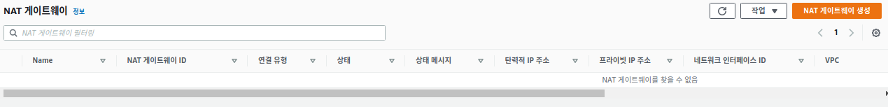 옆에 있는 선택 바에서 NAT 게이트웨이를 선택합니다. 오른쪽 위에 NAT 게이트웨이 생성을 클릭해줍니다.