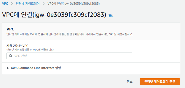 연결하고 싶은 VPC를 연결한 후, 인터넷 게이트웨이 연결 버튼을 클릭합니다.