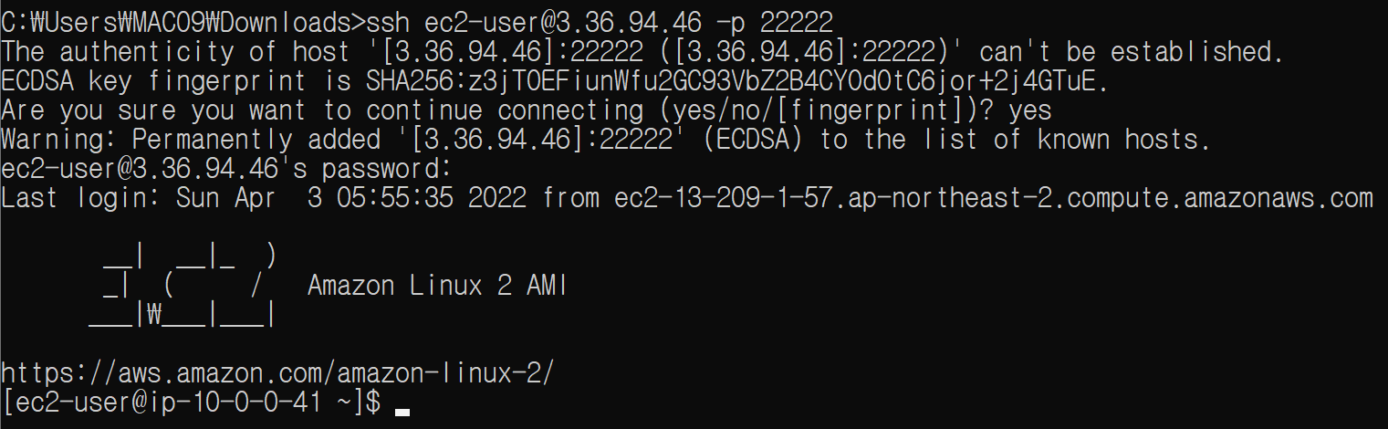 ssh ec2-user@<ec2 instance-ip> -p <port 번호>